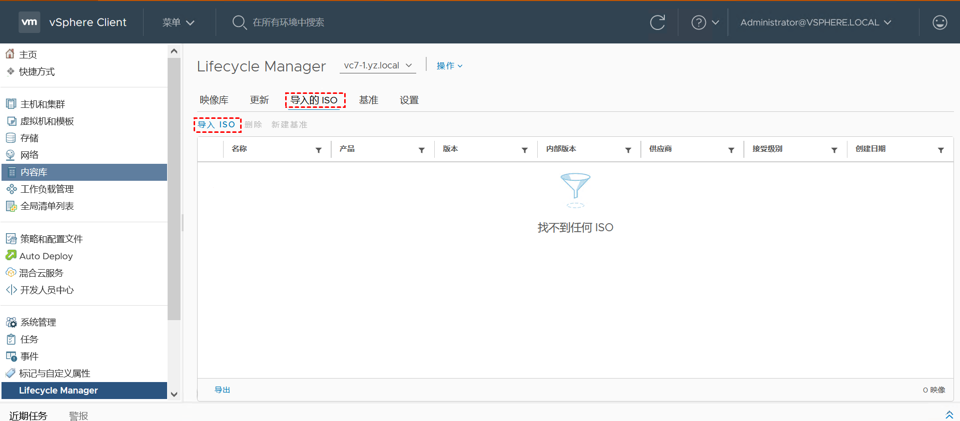 2. 單擊“導(dǎo)入的ISO”>“導(dǎo)入ISO”導(dǎo)入ESXi 7.0的ISO映像。