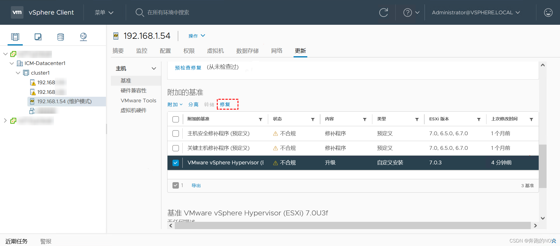 10. 要修復(fù)單個ESXi主機,請將ESXi主機置于維護模式。選擇ESXi 7.0升級基準并單擊“修復(fù)”。