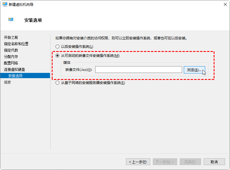 5. 在連接虛擬硬盤(pán)窗口中,選擇一個(gè)位置并指定虛擬硬盤(pán)的大小。然后轉(zhuǎn)到“安裝選項(xiàng)”向?qū)?,選擇“從可啟動(dòng)的映像文件安裝操作系統(tǒng)”,然后通過(guò)點(diǎn)擊“瀏覽”選擇Windows 10 .iso文件。單擊“下一步”創(chuàng)建安裝了Windows 10的Hyper-V虛擬機(jī)。