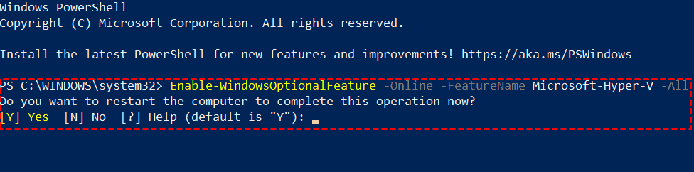 3. 除了在Windows功能中啟用Hyper-V,您還可以在Windows PowerShell中通過(guò)鍵入命令:Enable-WindowsOptionalFeature -Online -FeatureName Microsoft-Hyper-V -All并按Enter安裝Hyper-V(系統(tǒng)管理員)。Hyper-V安裝完成后,需要按“Y”重新啟動(dòng)計(jì)算機(jī)。