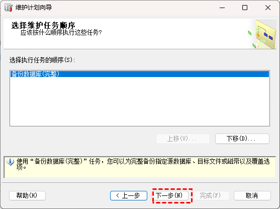 4.?“選擇一項或多項”要執(zhí)行的任務。例如:備份數(shù)據(jù)庫(完整)和維護清理任務。