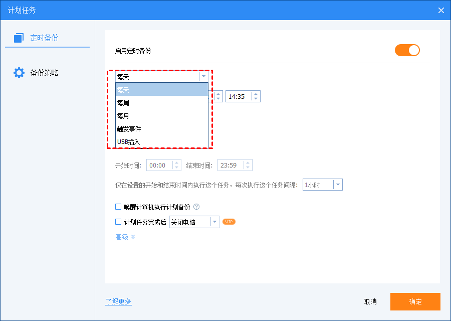 4. 點擊“計劃”選項通過每日、每周、每月、事件觸發(fā)器或 USB 插件運行 MySQL數(shù)據(jù)庫文件備份任務,在高級選項卡中選擇“增量備份”。