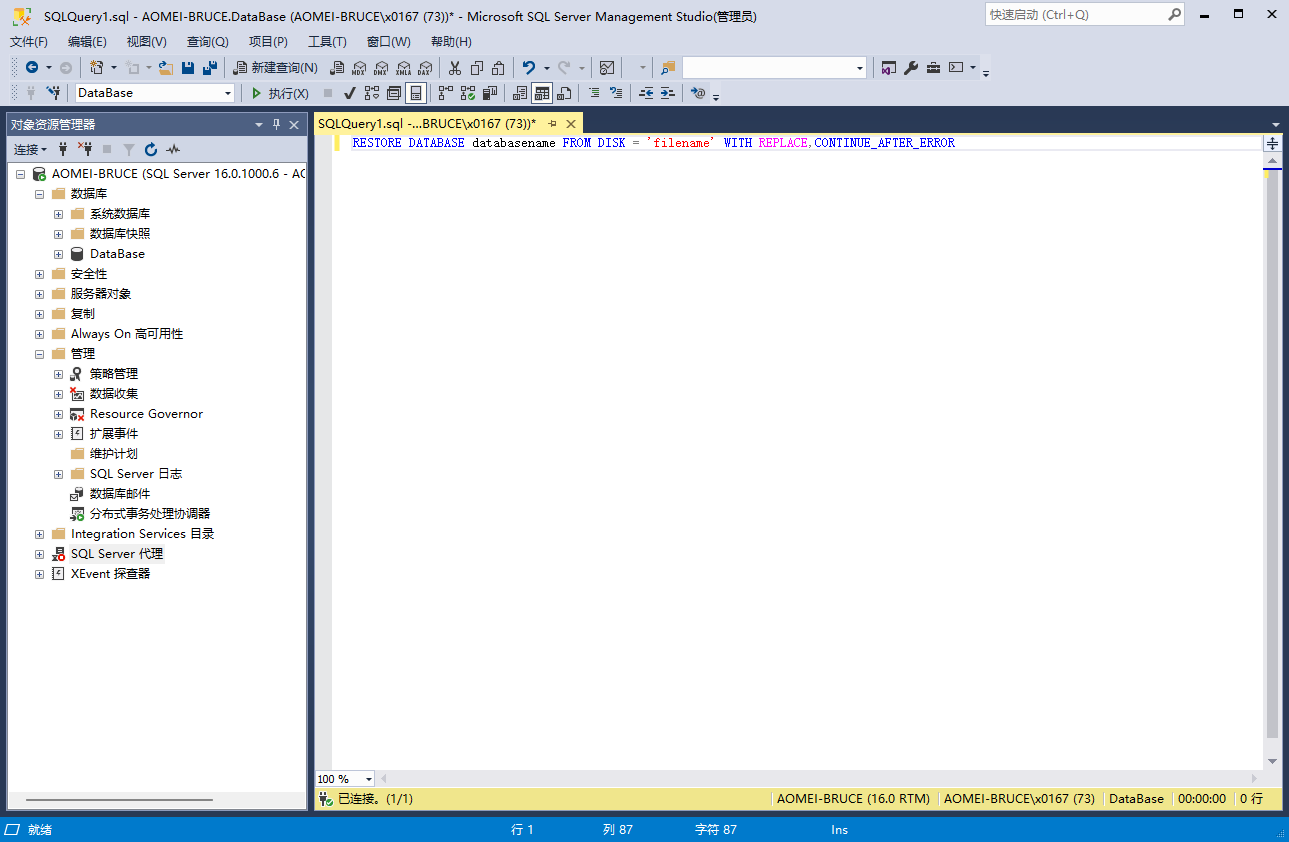 RESTORE DATABASE 數(shù)據(jù)庫(kù)名 FROM DISK = 'filename' WITH REPLACE,CONTINUE_AFTER_ERROR