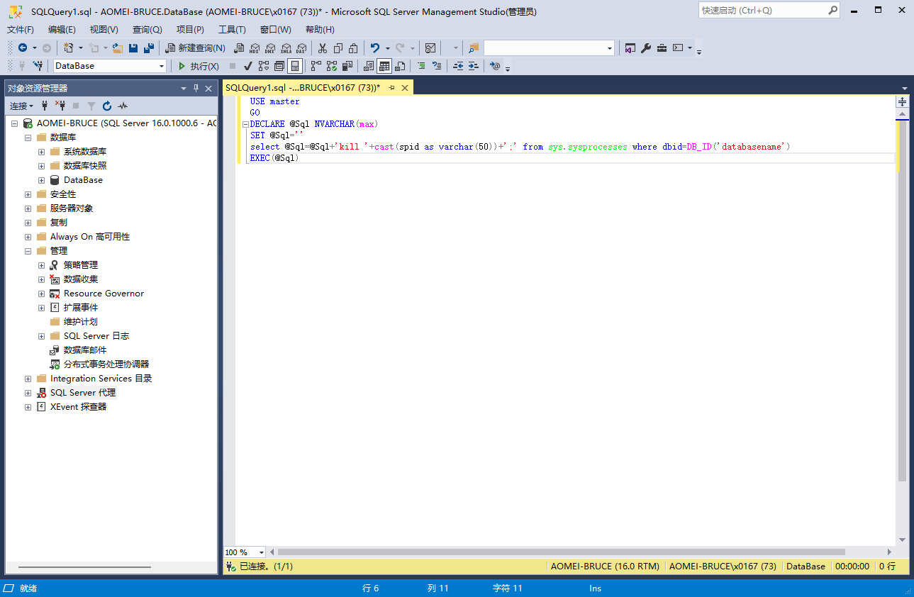 select @ Sql=@Sql +'kill '+cast(spid as varchar(50))+';' 來(lái)自 sys.sysprocesses where dbid=DB_ID(' databasename ')