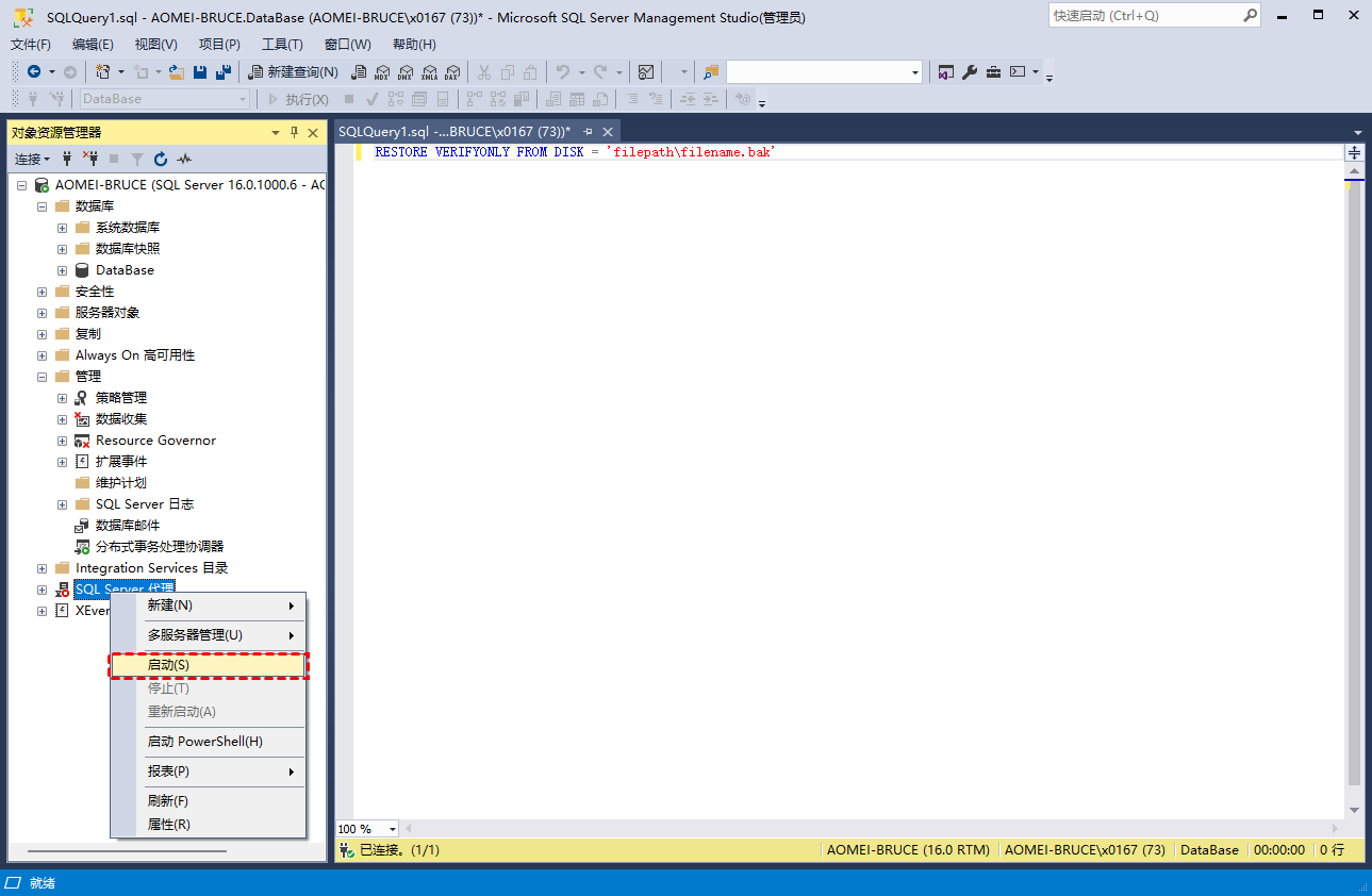 1. 啟動(dòng)SSMS并連接到您的實(shí)例,右鍵單擊SQL Server 代理,選擇Start。