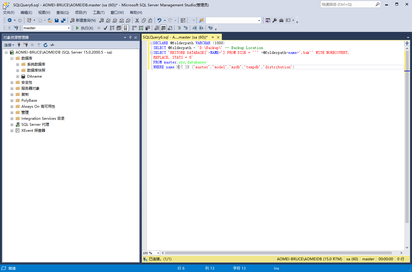 3. 將這些命令粘貼到 SQLQuery 窗口作為新腳本“執(zhí)行”。它將從具有相應文件名的 bak 文件中恢復SQL Server的所有數(shù)據(jù)庫。