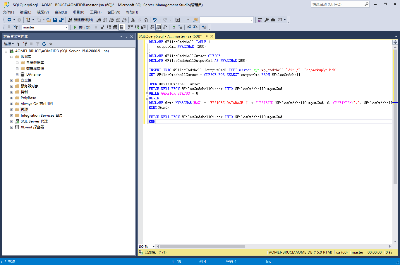 您可以使用腳本從一個文件夾中實現(xiàn)SQL Server 中恢復多個數(shù)據(jù)庫。但在此之前,請連接到實例并啟用 xp_cmdshell。