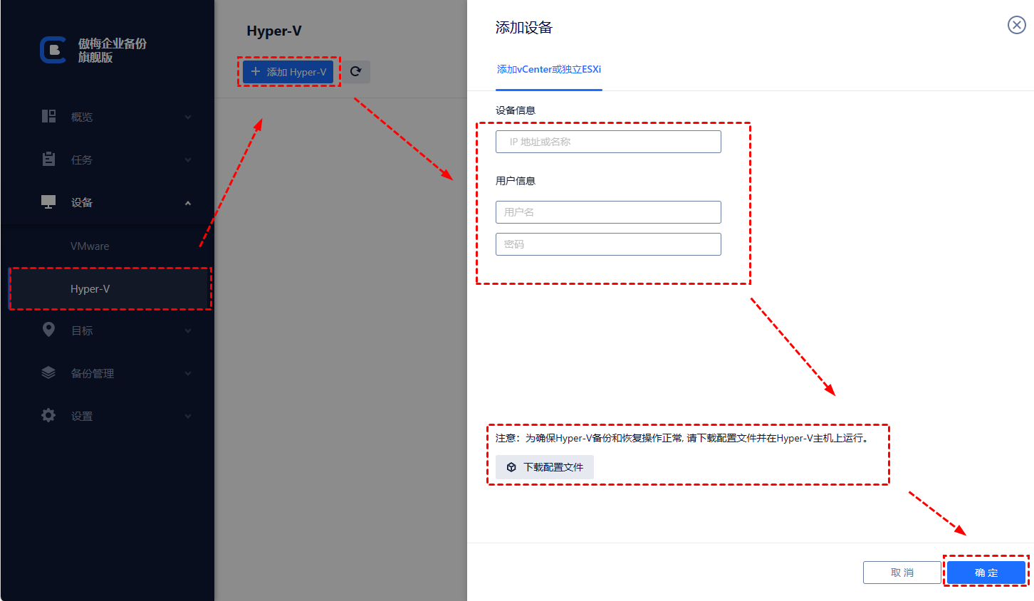 1. 綁定設(shè)備:訪(fǎng)問(wèn)傲梅網(wǎng)備份web客戶(hù)端,導(dǎo)航至設(shè)備> VMware/Hyper-V > +添加VMware設(shè)備/Hyper-V添加主機(jī)。然后點(diǎn)擊... >綁定設(shè)備。