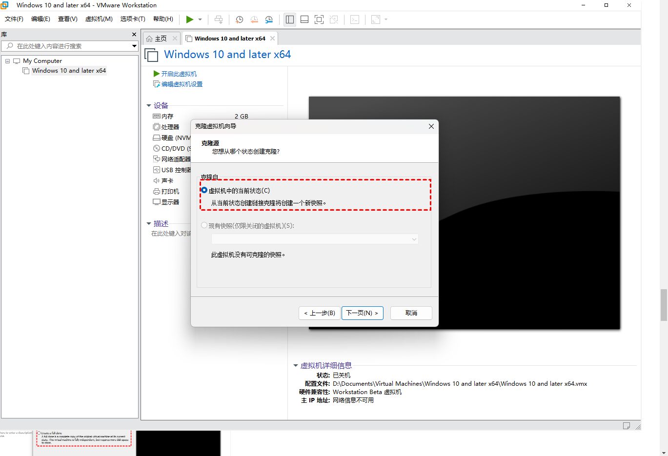 2.指定克隆源。您可以選擇從虛擬機(jī)的當(dāng)前狀態(tài)或現(xiàn)有快照(僅關(guān)閉電源)克隆。如果選擇上一個(gè),工作站將在克隆之前創(chuàng)建一個(gè)快照;如果您沒(méi)有可用的快照,則無(wú)法選擇第二個(gè)選項(xiàng)。