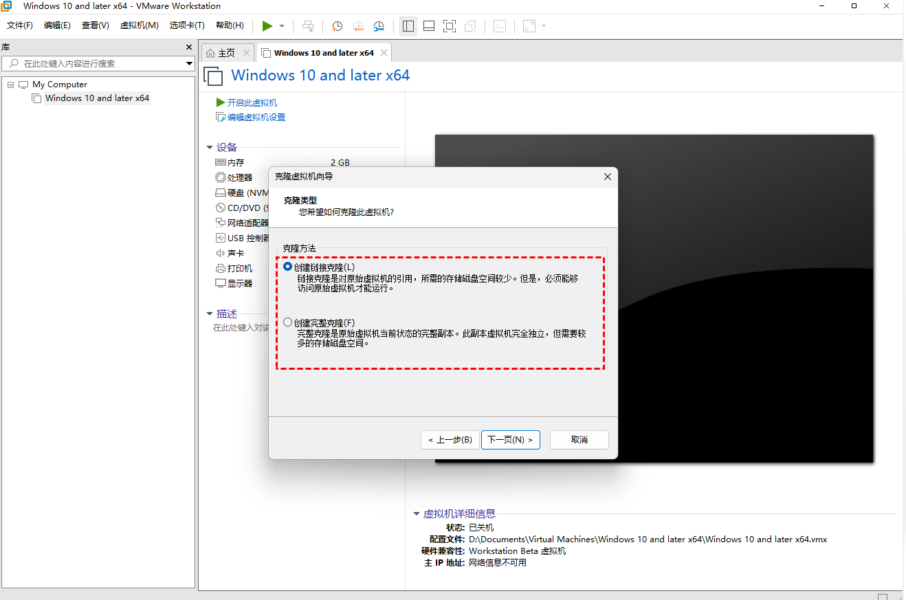 3. 單擊下一步繼續(xù),并指定克隆類(lèi)型。您可以創(chuàng)建鏈接克隆,或創(chuàng)建完整克隆。