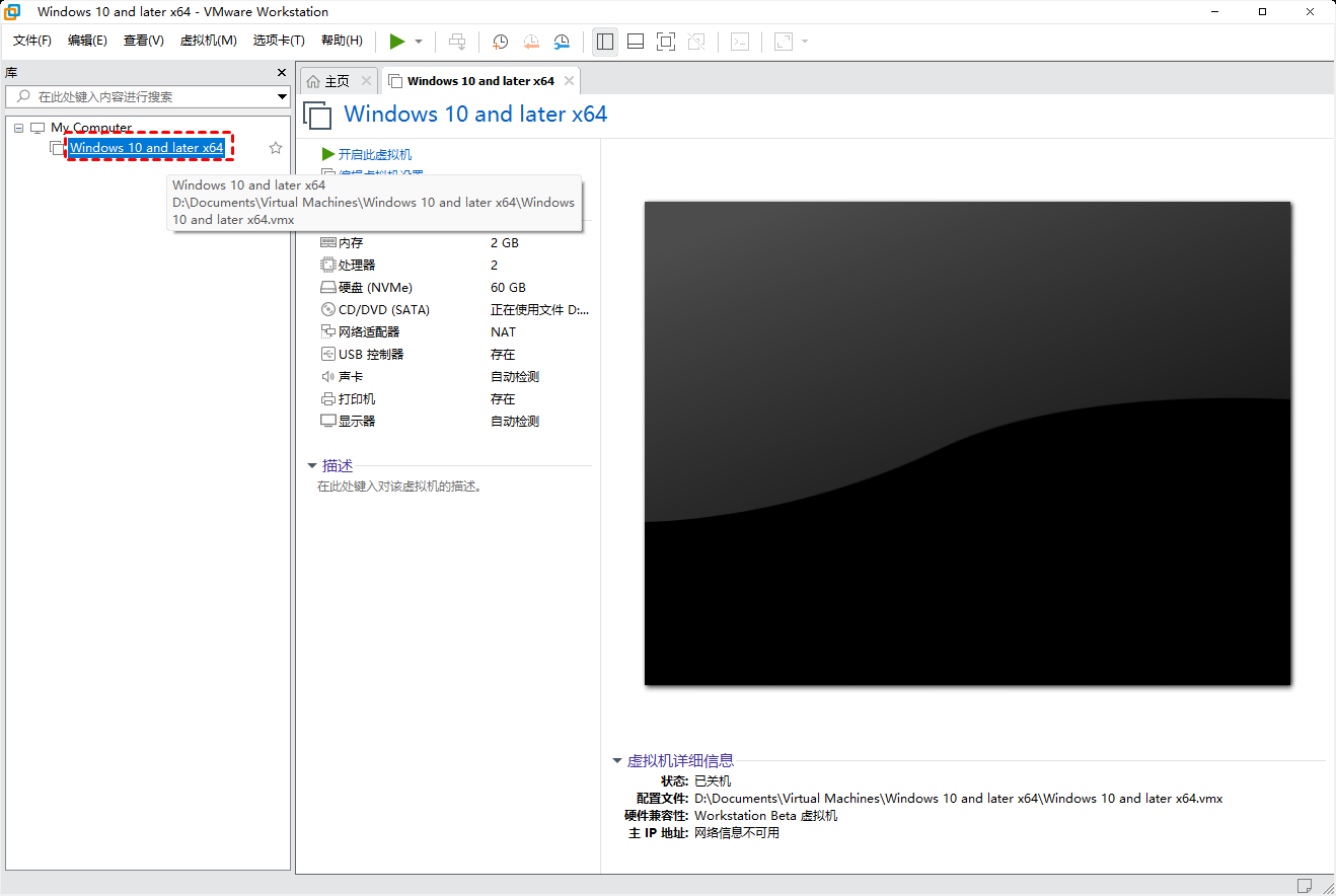 1. 啟動(dòng)VMware Workstation,將光標(biāo)移動(dòng)到要備份的虛擬機(jī)的名稱(chēng)。將出現(xiàn)一個(gè)框,顯示本系統(tǒng)的虛擬磁盤(pán)文件和配置文件所在的文件夾路徑。