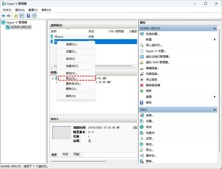 1. 啟動(dòng)Hyper-V 管理器。右鍵單擊要備份的 VM,選擇導(dǎo)出...