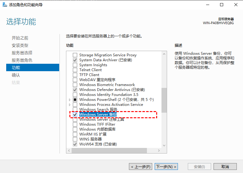 1. 啟動(dòng)服務(wù)器管理器。點(diǎn)擊管理 -> 添加角色 -> 功能 -> 下一步 -> 繼續(xù)角色或功能的安裝 -> 下一步。從服務(wù)器池中選擇服務(wù)器并進(jìn)入功能頁(yè)面,在功能列表中找到并檢查Windows Server 備份以進(jìn)行安裝。