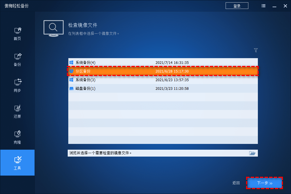 步驟二:選擇一個備份點,點擊“下一步”。然后鏡像檢查操作會自動執(zhí)行。檢查結(jié)果會列出,點擊“完成”退出界面。
