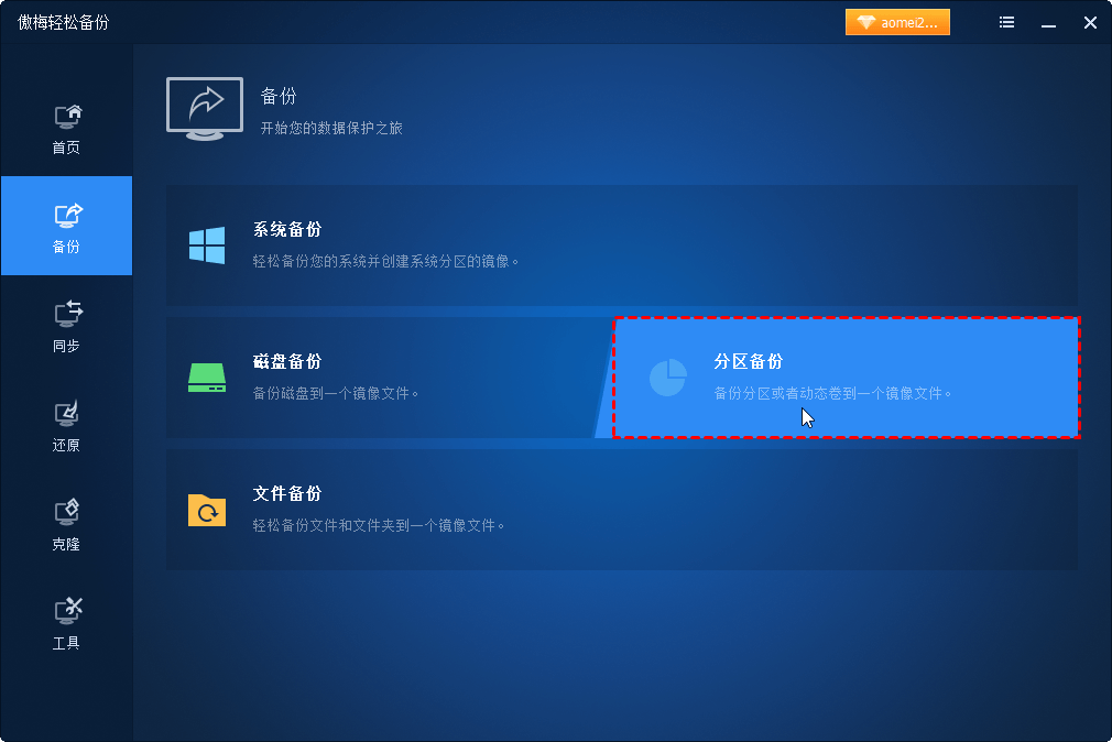 起初,選擇一種備份類型,這里以“分區(qū)備份”作為例子。