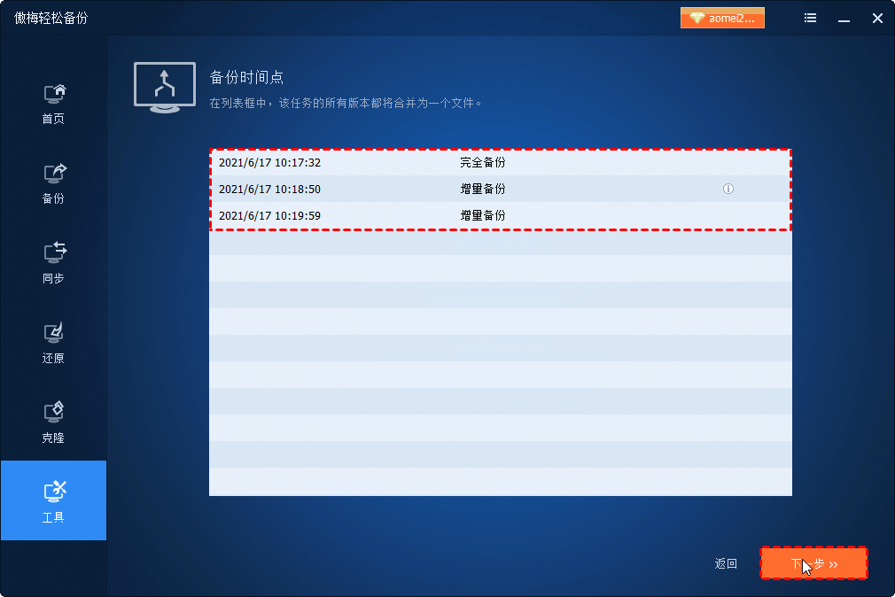 ? “合并鏡像”只能合并正確排序的增量備份映像。如果此備份任務(wù)包含差異備份的任何版本,傲梅輕松備份程序?qū)⑻嵝涯荒芎喜⑺鼈儭?/p>