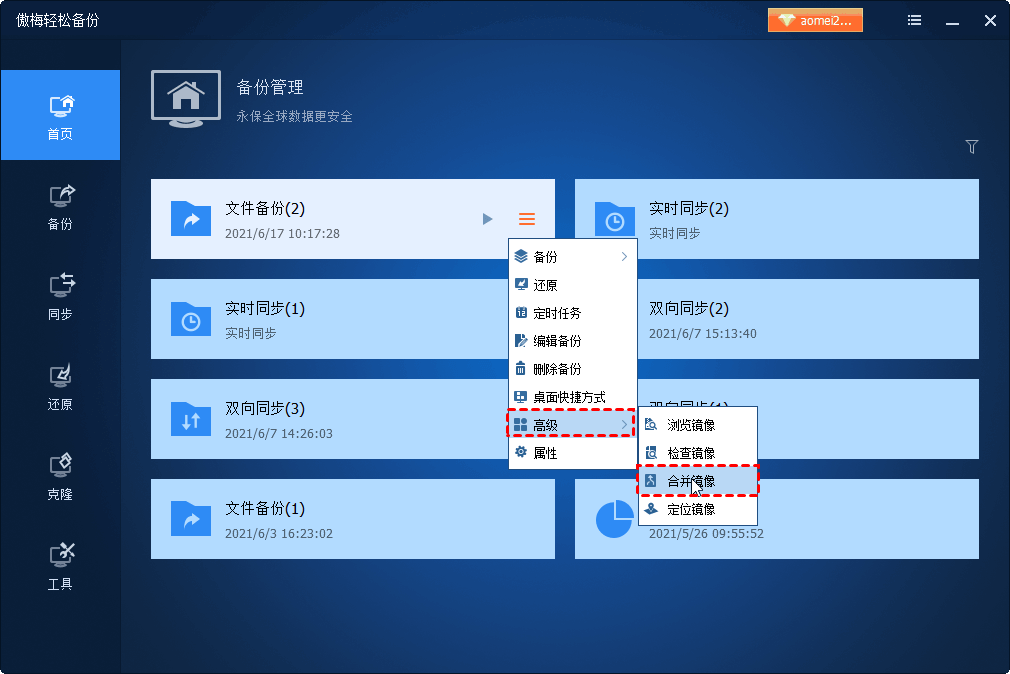 在首頁(yè)上,從備份管理窗口中選擇目標(biāo)備份任務(wù)將鼠標(biāo)指針懸停在任務(wù)名稱上并單擊三行圖標(biāo)。單擊選擇“高級(jí)” > “合并鏡像”。