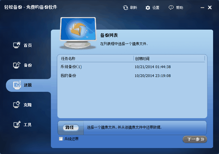 方法一:點擊左邊的“還原”欄,備份會列出來。點擊需要還原的備份任務(wù),再點擊“下一步”。