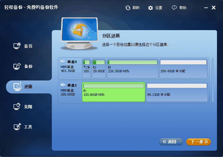 輕松備份啟動后,會將你之前做的備份任務(wù)顯示到“還原”界面的列表框中,你可以直接選擇相應(yīng)的任務(wù)進行還原,也可以通過打開鏡像文件的方式進行還原。以下是分區(qū)還原的具體步驟:
