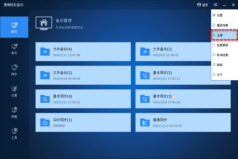 步驟1. 打開傲梅輕松備份,在主界面中點(diǎn)擊右上角的三橫線選項(xiàng),然后在下拉菜單中選擇“注冊(cè)”。
