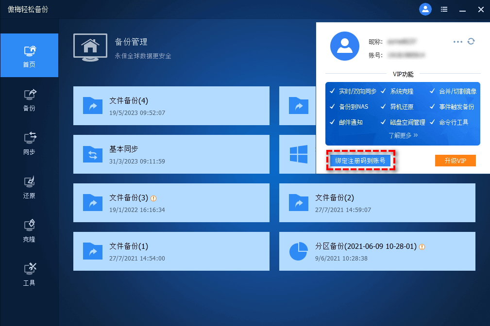注意:如果您是在傲梅輕松備份軟件中內(nèi)購(gòu)的VIP的話,則無需單獨(dú)注冊(cè)VIP,軟件會(huì)自動(dòng)激活并解鎖相關(guān)的高級(jí)功能,如果沒有自動(dòng)激活,重啟一下軟件即可。