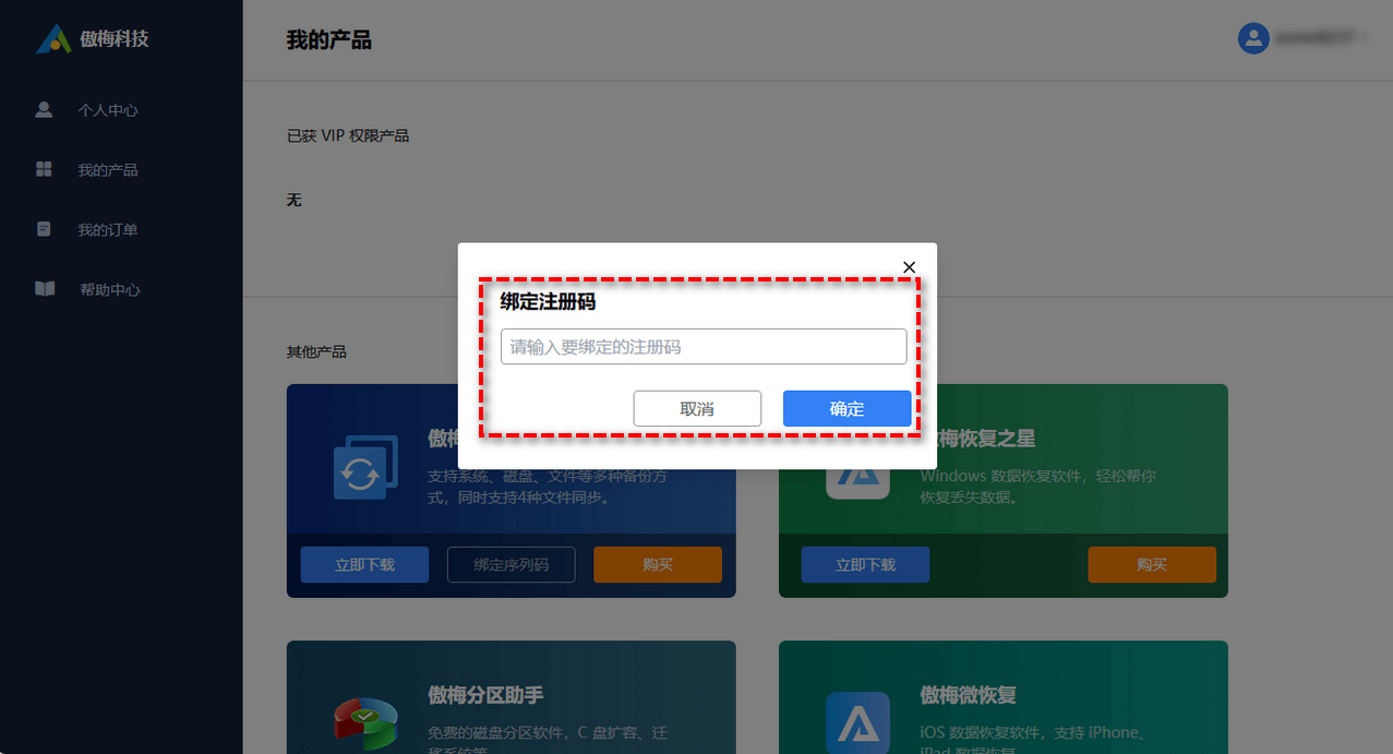 步驟2. 接下來會(huì)自動(dòng)進(jìn)入到傲梅輕松備份用戶信息網(wǎng)頁(yè)中,并且會(huì)出現(xiàn)一個(gè)彈窗,請(qǐng)您在其中輸入您購(gòu)買的注冊(cè)碼,然后點(diǎn)擊“確定”即可完成注冊(cè)傲梅輕松備份VIP任務(wù)。