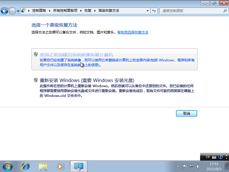 如果您之前創(chuàng)建了系統(tǒng)鏡像備份,則只需將計算機恢復到運行良好的較早日期即可。在這種情況下, 輕松實現(xiàn)無光盤無u盤重裝系統(tǒng)Windows 7。