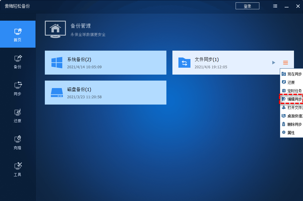 如果您已經(jīng)創(chuàng)建了同步任務(wù),但是尚未啟用定時(shí)同步任務(wù),則可以通過“首頁”中對應(yīng)同步任務(wù)的選項(xiàng)欄中選擇“編輯同步”,然后再按照方法一的流程設(shè)置同步計(jì)劃任務(wù)。