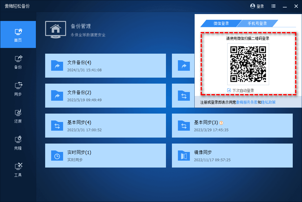 注意:在軟件上成功注冊(cè)并登錄賬號(hào),軟件將保留您的登錄信息,以后再次打開(kāi)傲梅輕松備份時(shí)將自動(dòng)登錄您的賬號(hào),無(wú)需重復(fù)登錄操作。