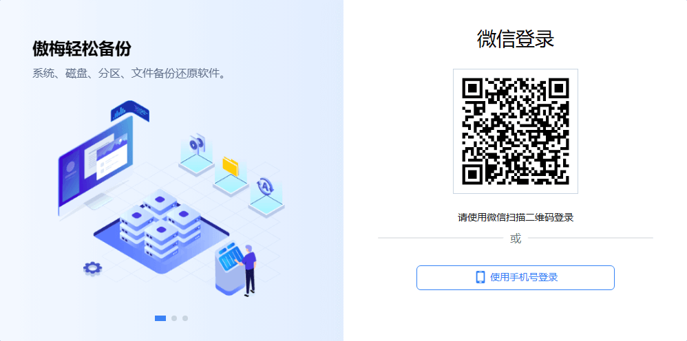 軟件默認(rèn)采用微信登錄方式,您可以使用自己的微信掃描二維碼,關(guān)注傲梅數(shù)安科技微信公眾號(hào),即可自動(dòng)注冊(cè)并登錄您的賬號(hào)。